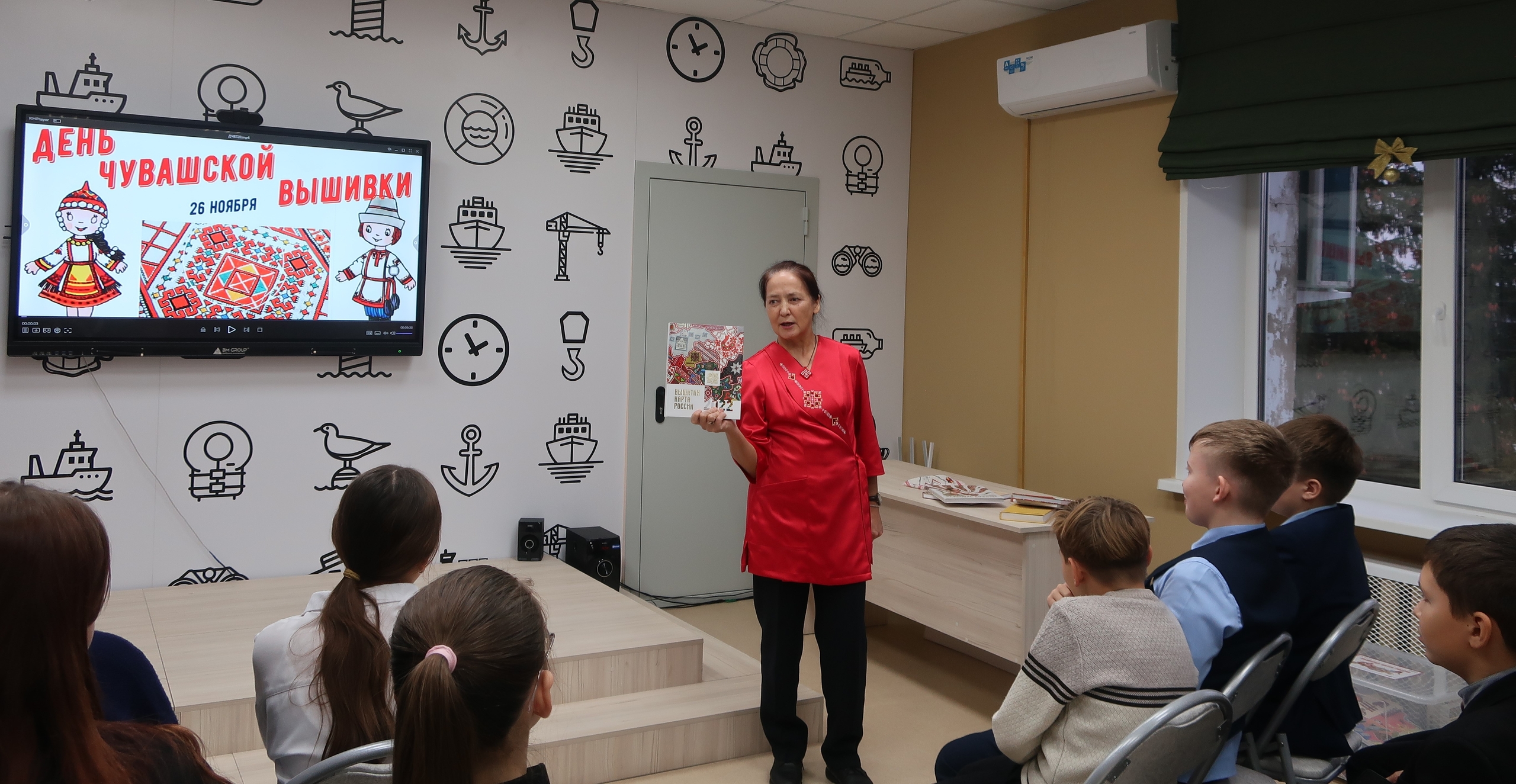 Ведущая мероприятия Н. Иванова продемонстрировала видеоурок «День чувашской вышивки», из которого ребята узнали историю этого праздника, о самой Е. И. Ефремовой, о едином 6-метровом полотне (чувашском головном покрывале - сурбане), вышитого мастерицами из 26 городов и районов республики в 2020 г. Подчеркнула, что из нашего округа приняла участие рукодельница из д. Можары Римма Иннокентьевна Юсова. Напомнила, что в 2021 году мастерицы чувашской вышивки создали вышитую карту Чувашии, а в 2022 году – вышитую карту России.
